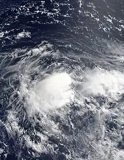 On 20 December, a tropical disturbance that was being monitored by Météo-France's tropical cyclone warning centre in Réunion crossed into the Australian region from the South-West Indian Ocean basin.[95] Upon entering the region, the system was classified as a tropical low by the Bureau of Meteorology (BOM), and had an estimated central atmospheric pressure of 1006 hPa (29.71 inHg).[96] Initially situated approximately 825 km (513 mi) west-northwest of the Cocos Islands, the system was located in an environment that was generally unfavourable for intensification, with moderate to strong vertical wind shear offsetting otherwise conducive upper-level outflow and warm sea surface temperatures of 28–29 °C (82–84 °F).[97][96] It again exited the basin on 28 December without any significant intensification where RSMC Réunion reclassified the system as Tropical Depression 05.[98]