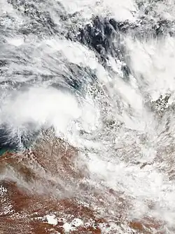 On 12 January, the Bureau of Meteorology noted that a monsoonal trough could develop within a week, that would make conditions in the Australian Region basin favorable for tropical cyclogenesis.[127] On 16 January, a weak tropical low formed to the northeast of Queensland.[128] Later that day, the Joint Typhoon Warning Center (JTWC) issued a Tropical Cyclone Formation Alert on the system.[129] At 02:10 UTC on 17 January, the Bureau of Meteorology upgraded the tropical low into Tropical Cyclone Kimi, while located northeast of Cooktown.[130] A small tropical cyclone, Kimi moved slowly southward while remaining offshore of the Australian coastline.[131] Late on 17 January, radar imagery from Cairns developed low-level convective rainbands, which wrapped into the storm's center of circulation.[132] Around this time, Kimi grew large bursts of deep convection, with a well-defined circulation visible on satellite imagery.[133] However organization began to slow on 18 January, with convection becoming displaced to the west of the center.[134] Radar from Townsville and satellite imagery showed that some unexpected wind shear had caused convection to now become displaced to the southeast of the center as the deep convection began to weaken from the wind shear. The wind shear also caused Kimi began to move away from the coast of Australia.[135] Late on 18 January, Tropical Cyclone Kimi weakened into a tropical low while moving slowly away from the North Queensland coast.[136]