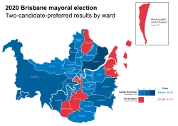 - ^ "Lord Mayor - Brisbane City Council 2020 Election Results | ECQ (Electoral Commission of Queensland)". ECQ (Electoral Commission of Queensland). Retrieved 28 March 2020.