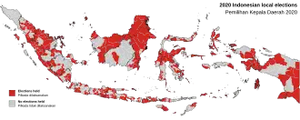 Simultaneous local elections (Pilkada Serentak) were first held in Indonesia in 2015.[2] The leadup to the 2020 elections saw several regulations being issued by the General Elections Commission (KPU) barring certain candidates from running, from adulterers[3] to politicians who had been charged with corruption.[4] The decision that the simultaneous local elections throughout Indonesia would be held amid the COVID-19 pandemic stirred some controversy in the Indonesian public.[5][6]