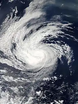 A tropical wave emerged off the west coast of Africa on June 20 and crossed into the East Pacific on July 3, where it interacted with the monsoon trough and began to organize. This system developed a defined surface low on July 6 and was classified as a tropical depression about 435 mi (700 km) south of Acapulco, Guerrero. Steered along a northwest trajectory by a mid-level ridge, the depression traversed a region of favorable conditions which enabled slow intensification.[28] Initial predictions from the NHC suggested significant strengthening of the cyclone.[29] However, Cristina instead encountered cooler waters and eventually drier air; it reached its peak intensity late on July 10 with winds of 70 mph (110 km/h) as it passed west of Socorro Island. Thereafter, the cyclone turned west along the south side of the subtropical ridge and steady weakened. The storm degraded into a remnant low around 18:00 UTC on July 12 and degenerated into a trough on July 15 about halfway between Hawaii and Baja California Sur.[28]