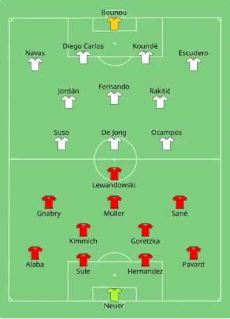 Sevilla were awarded a penalty after 13 minutes when Ivan Rakitić was blocked and bundled over in the penalty area by David Alaba. Lucas Ocampos scored the penalty shooting to the left corner to put Sevilla ahead. Leon Goretzka made it 1–1 in the 34th minute, with a side foot finish to the left corner of the net after a take down assist from Robert Lewandowski.[20] The game went into extra time, with substitute Javi Martínez getting the winner for Bayern in the 104th minute with a powerful header to the top left corner of the net when the ball fell to him, after Sevilla goalkeeper Yassine Bounou had punched the ball back into play.[21]
