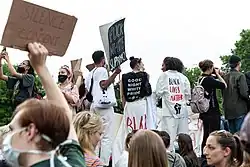 For Black American and Black British youth, hip hop fashion became more politicized. This was due to the influence of social justice rappers including Stormzy,[312] No Name,[313] the Black Lives Matter movement, and a resurgence of interest in past civil rights organizations such as the Black Panther Party.[314] Slogan T-shirts inspired by punk fashion,[315] black leather jackets or trench coats,[316] hoodies,[317] black sweatpants, face-concealing black bandanas, dark glasses, marijuana motifs, skull masks, morale patches, paramilitary tactical vests,[314] and camouflage patterns were popular. Black American activists in the American south sometimes wore blue union army kepis at the demolition of Confederate statues to taunt lost cause revisionists and white supremacists.