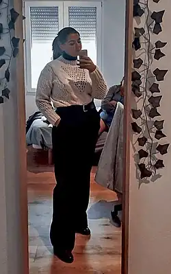 During the pandemic, fashion trends evolved significantly, with a notable shift towards comfort. This change was particularly evident in American public schools and universities, where students embraced more relaxed and casual clothing options. As remote learning became normalized, students in both K-12 schools and higher education increasingly favored comfortable clothing like pajamas, crew socks, sweatpants, and athleisure wear.[22] The shift toward casual dress codes allowed students to prioritize comfort over formality, even in academic settings.[23][24] Pajama pants and loungewear became common choices for students attending classes virtually, reflecting a broader cultural shift toward prioritizing comfort, functionality, and ease.[25][26] In many cases, the rise of remote learning and video conferences further encouraged this trend, leading students to opt for attire that was easy to wear and allowed them to feel at ease while still participating in their academic work. This trend persisted after quarantine, as many students continued to embrace comfortable clothing in public school and university settings.[27] In the United States, it became common for students in public schools and universities to wear pajama-style pants and loungewear, even for in-person classes. Many students, especially in higher education, opted for outfits that combined comfort and practicality, maintaining a casual approach to school fashion even after returning to physical classrooms.[28][29]