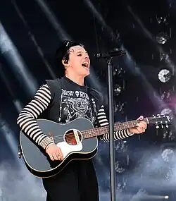 Many Gen Z and Gen Alpha E-kids combined late 2000s emo, pop-punk, skater, and vintage aesthetics to create a distinct style. Alternative music fans from the UK and America often wore graphic t-shirts, platform boots, fishnet tights, BDSM collars, bold eye makeup, graphic hoodies, wide-leg pants, dark colors with neon accents, and hi-top sneakers like Vans or Converse All Stars. Layered clothing, such as oversized t-shirts or jackets, was paired with studded belts, tripp pants, and skull jewelry. Brands like Ed Hardy, Hot Topic, and Affliction, which were popular in the late 2000s, made a return, integrating past fashion trends with contemporary preferences. These styles were shared on platforms like TikTok and YouTube, where users blended nostalgia with current trends, creating a fashion movement that reflected both historical and modern cultural influences. The pop punk revival of early 2020s saw artists like Machine Gun Kelly and Yungblud[308] influenced by the e-boy look, blending alterative fashion with their music.[309][310][311]