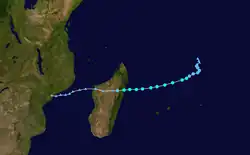 On 10 February, MFR began monitoring an area of disturbed weather,[71] with the JTWC designating the system as an invest a day later.[72] By 12 February, it had been upgraded to a tropical disturbance by MFR, before being upgraded to a tropical depression later that day.[71] The JTWC assessed that the system had developed into a tropical cyclone on 13 February, giving it the designation 12S.[73] MFR upgraded the system to a moderate tropical storm later that day, being given the name Dumako by the Mauritius Meteorological Service.[74] By 14 February at 00:00 UTC, MFR estimated Dumako to have peaked in intensity, with maximum 10-minute sustained winds of 95 kilometres per hour (60 mph) and a minimum central pressure of 992 hPa (29.29 inHg).[71] Dumako continued westward, and by the next day, it had made landfall near Sainte-Marie Island.[75] MFR downgraded Dumako to a tropical depression later that day,[71] with the JTWC doing the same at 00:00 UTC on 16 February.[76] Dumako re-emerged over water on the same day,[77] before being assessed to have lost tropical depression status by MFR on 17 February. Dumako dissipated on 18 February as it made landfall over Mozambique close to the city of Quelimane.[71]