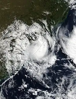 On 6 March, the MFR began to monitor a zone of disturbed weather located approximately 280 nmi (520 km; 320 mi) from Mauritius, moving northward.[106] The JTWC later tagged the system as Invest 97S, and issued a TCFA for the storm at 11:40 UTC on 6 March.[107] The next day, the MFR upgraded it to a tropical depression on 12:00 UTC, with it being named Moderate Tropical Storm Gombe six hours later. The JTWC followed, upgrading Gombe to a tropical storm with winds of 35 kn (65 km/h; 40 mph) at 18:00 UTC on 7 March.[108][109] The MFR re-classified Gombe as an overland depression at 06:00 UTC as it made landfall in northern Madagascar on 8 March,[110] and the JTWC downgraded the storm to a tropical depression.[111] 24 hours later, Gombe emerged over the Mozambique Channel, and strengthened back to a tropical storm.[112] Gombe gradually re-developed its structure, and then intensified to a high-end tropical storm late on 9 March, and gained Category 1-equivalent winds by 06:00 UTC on 10 March.[113] As it neared landfall on Nampula Province, it underwent rapid intensification and strengthened from 65 to 100 kn (120 to 185 km/h; 75 to 115 mph) in 18 hours.[114] The MFR upgraded Gombe to the fourth Intense Tropical Cyclone of the year at the same time.[115] Following Gombe's landfall in Mozambique, it proceeded to lose most of its convection the next day. The MFR downgraded the storm to an Overland Depression for the second time on 06:00 UTC on 11 March.[116] In the technical bulletin released on 17 March by the MFR, the agency noted that what was left of Gombe reorganized itself into a tropical depression in the Mozambique channel.[117] Later that day, however, the MFR issued their final bulletin on the storm.