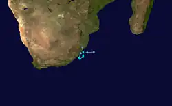 On 11 April, a low-pressure area evolved near the southeast coast of South Africa from the interaction of an upper-level trough and warmer air near the surface. With warm ocean temperatures and low wind shear, the low developed intense thunderstorms which wrapped around a tight circulation, and dropped heavy rainfall in eastern South Africa. On 12 April, the MFR designated the low as Subtropical Depression Issa, based on the system's structure and the presence of gale-force winds. Issa moved slowly to the south at first,[124] strengthening to reach 10-minute sustained winds of 95 km/h (60 mph) late on 12 April. At its peak, the storm had an eye-like feature in the middle of a symmetrical area of thunderstorms.[125] On 13 April, the JTWC classified this system as a subtropical storm in an unofficial bulletin.[126] Issa turned to the north back toward the South African coast due to the trough in the region.[127] Increased wind shear and dry air stripped away the thunderstorms near the center, weakening the storm, and causing the MFR to discontinue advisories on 13 April.[128]