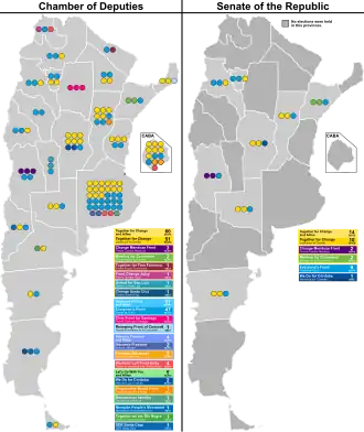 127 of the 257 seats in the lower chamber were renewed, while eight provinces (Catamarca, Chubut, Córdoba, Corrientes, La Pampa, Mendoza, Santa Fe and Tucumán) each renewed their 3 senators, in total accounting for 24 out of 72 seats in the upper chamber.[2]