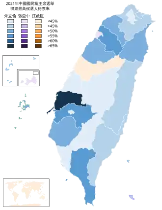 Polls were open from 8 a.m. to 4 p.m. on 25 September 2021.[31] Eric Chu received 85,164 of 187,999 votes cast, finishing ahead of Chang Ya-chung (60,632 votes), Johnny Chiang (35,090 votes), and Cho Po-yuan (5,133 votes). Voter turnout was 50.71 percent.[32][33] The election results were confirmed by the Kuomintang's Central Standing Committee on 29 September.[34][35] Although Central Standing Committee member Lin Chin-chieh suggested that Chu take office as soon as possible, the committee voted for Chu to assume the chairmanship on 5 October 2021.[35] Chu was duly inaugurated as chairman on that date.[36][37]