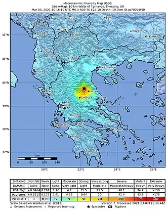 On March 3, 2021, 12:16:09 (UTC +2) the 2021 Larissa earthquake had a magnitude of 6.3 Mw with an intensity of VIII (Severe) on the Mercalli Scale 9 kilometers west of Týrnavos, Greece.[2] One person was confirmed dead with eleven other people injured.[3] Light shaking was also felt as far as Albania, North Macedonia, Kosovo and Montenegro.[4]