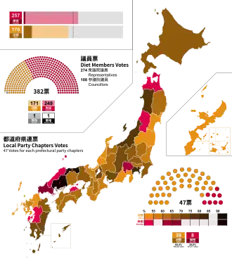 If no candidate receives a majority of votes in the first round, a runoff is held immediately between the top two candidates.[10] In the runoff, all Diet members vote again while the 47 prefectural chapters of the LDP get one vote each, with the result of the latter votes determined using the first round results of party members in each prefecture.[10] The candidate who wins the most votes in the runoff is then elected President.[10]