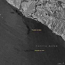 An alarm from a leak detection system sounded at 4:10 p.m. on October 1 and the operators shut down the pipeline. Believing that the system was providing false alarms for a leak at the platform, they began a series of restarting and stopping the flow of oil throughout the night.[8] In the afternoon and evening of October 1, Huntington Beach and Newport Beach residents were already noticing a strong odor and called the police department to report the smell of oil fumes or hot roofing bitumen. Multiple calls concerning a possible spill north of the Huntington Beach Pier came in over a marine radio emergency channel from boats leaving the Pacific Airshow.[9] The harbor patrol looked for the spill but found nothing on the water.[10] In the evening, a foreign ship anchored off the coast reported a possible oil slick about 5 miles (8.0 km) west of Huntington Beach. A satellite image from the European Space Agency was reviewed by a National Oceanic and Atmospheric Administration analyst which confirmed a substance on the water which was most likely petroleum.[11] The Marine Oil Spill Thickness (MOST) project also deployed Uninhabited Aerial Vehicle Synthetic Aperture Radar (UAVSAR) to assist by measuring the thickness of the oil spill from an aircraft.[12] The National Response Center, staffed by United States Coast Guard officers and marine science technicians, is the sole federal point of contact for reporting all hazardous substances releases and oil spills. They forwarded the information to the Office of Spill Prevention and Response (OSPR), a division of the California Department of Fish and Wildlife charged with handling such emergencies.[13] OSPR dispatched but encountered foggy conditions. The Coast Guard and Orange County Sheriff's Department flew out once the fog had lifted to the reported leak location to investigate.[14] Control room operators on platform Elly shut down the pipeline at 6:01 a.m. on October 2 in response to a low-pressure alarm according to the Pipeline and Hazardous Materials Safety Administration after ignoring 83 alarms indicating the offshore pipeline was leaking for about 17 hours.[15] They also failed to notify the Coast Guard until 9:07 a.m.[16] The pipeline was suctioned at both ends to stop the flow of oil after it was shut down.[6]