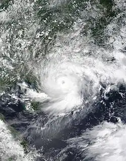 On May 11, the JTWC noted a persistent area of convection in the Philippine Sea, approximately 184 nmi (341 km) west of Palau.[41] The JTWC issued a TCFA for the convection on May 12, as it further developed in an environment with low vertical wind shear and warm sea surface temperatures.[42] Just three hours later, the agency recognized that the area of convection had quickly consolidated into a tropical depression and assigned it with the identifier of 03W.[43] Around the same time, the JMA had also recognized the storm as a tropical depression while it was to the east of Mindanao.[44] Since the storm developed within the Philippine Area of Responsibility, the PAGASA immediately named the storm Crising once the agency recognized it as a tropical depression as well, and later raised Signal No. 2 warnings for areas in Mindanao.[45][46] In the early hours of May 13, the JTWC upgraded the system into a tropical storm, with the PAGASA following suit hours later.[47][48] Later that day, Crising's low-level circulation center became exposed due to wind shear, and it lost organization. At 8:20 p.m. Philippine Standard Time (12:20 UTC), Crising made landfall in Baganga, Davao Oriental as a weakening tropical storm. It quickly degraded as soon as it made landfall, with both the JTWC and the PAGASA downgrading it to a tropical depression at 15:00 UTC.[49][50] At 03:00 UTC on that day, the PAGASA reported that the system degenerated to an area of low-pressure in the vicinity of Piagapo in Lanao del Sur, thus lifting all warning signals on Mindanao and issuing their final advisory.[51] On May 14, the system dissipated over the Sulu Sea, and both the JMA and the JTWC issued their final advisories on the storm.