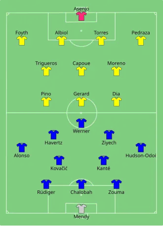 Chelsea opened the scoring after 27 minutes when Kai Havertz's low cross from the left was swept into the net by Hakim Ziyech from seven yards out. Ziyech was substituted after a shoulder injury just before half-time. Alberto Moreno hit a volley off the underside of the crossbar in first-half injury time. Villarreal equalised in the 73rd minute when Gerard Moreno scored with a clinical right-foot finish to the top left corner of the net after a flick-back from Boulaye Dia on the right of the penalty area.[12] The match went to extra-time with Chelsea goalkeeper Édouard Mendy being replaced in the last minute by Kepa Arrizabalaga. Arrizabalaga saved two penalties, the decisive one low to his right from Raúl Albiol allowed Chelsea to win 6–5 in the shoot-out.[13]