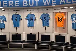 City began pre-season with several key first-team players entering the final years of their contract amidst rumours that they might leave the club for a fee rather than renew. Of these, it seemed the most speculation concerned Gabriel Jesus and his possible transfer to Arsenal, Tottenham Hotspur or Real Madrid after five years at City, and Raheem Sterling, who was also rumoured to be a Real Madrid target. Both players would, in theory, compete with the incoming Haaland and Álvarez for playing time if they remained.[8] Jesus left City for Arsenal for a reported fee of £45 million on 4 July.[9] Sterling went on to join Chelsea on 13 July for a fee reported to be about £47.5 million, with £2.5 million of add-ons. He had won eleven domestic titles in seven seasons at Manchester City, scoring 131 goals in 339 appearances, and was the club's 11th-highest scorer of all time.[10]