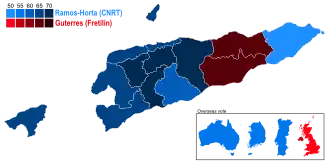 The second round of the elections was held on 19 April between José Ramos-Horta, a former president, and the incumbent Francisco Guterres. In the runoff Ramos-Horta prevailed with 62% of the vote.[21]