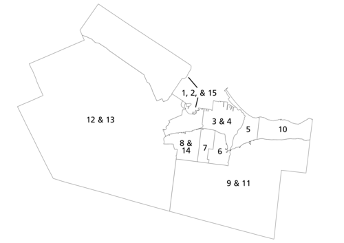 On 28 February 2022, HWDSB trustees were provided a report by school board staff outlining issues with the board's current ward parings. Provincial legislation affords the HWDSB 11 trustees, requiring the board to combine some municipal wards to create a single trustee ward. For the 2018-2022 term, Wards 1 & 2 (West Lower City), Wards 9 & 10 (Stoney Creek), Wards 8 & 14 (West Mountain), and Wards 11 & 12 (Ancaster-Glanbrook) were combined. Population growth in Wards 1 & 2 necessitates the wards being offered their own trustees, requiring new ward parings. The trustees rejected a request by staff to select a new pairing, opting instead to offer members of the public a chance to comment on new proposed pairings.[30] On 28 March 2022, trustees approved new ward parings, dividing Wards 1 & 2 and creating new pairings out of Wards 5 & 10 and 6 & 9.[31]