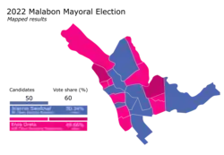 Local elections was held in Malabon on May 9, 2022 within the Philippine general election . The voters will elect for the elective local posts in the city: the mayor, vice mayor, the two Congressmen, and the twelve councilors for the city's two Sangguniang Panglungsod districts, six for each district.