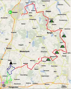 The 156 kilometres (97 mi) route from Assen to Hoogeveen uses generally flat roads in the Drenthe region of the Netherlands, with the challenge being four ascents of the VAMberg - a hill built on a landfill site. The climb is 750m in length with an average gradient of 4.2% and a maximum gradient of 20%.[3] Other difficulties are the ten cobbled sections on the route.[4]