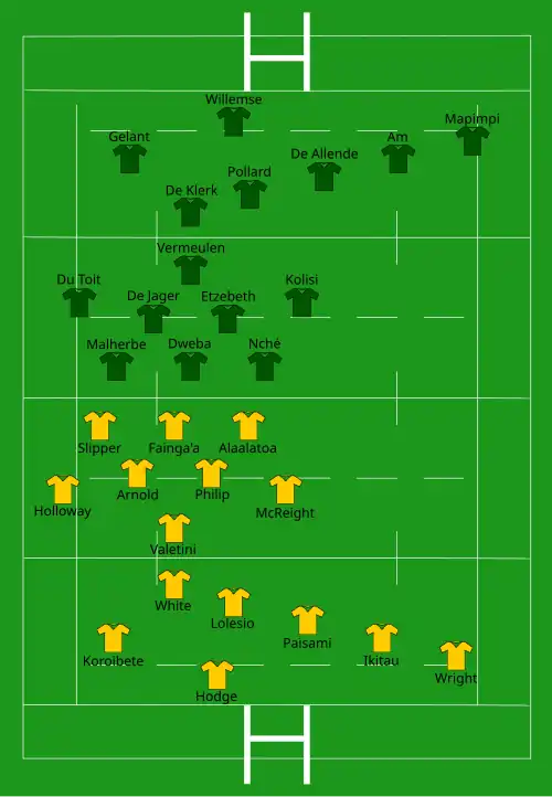 | Try: McReight (2) 2' c, 57' c Koroibete 47' m Con: Lolesio (2/3) 2', 58' Pen: Lolesio (2/2) 6', 63' | Report | Try: Smith (2) 75' c, 80' c Con: Jantjies (1/1) 75' Hendrikse (1/1) 80' Pen: Pollard (1/3) 23' |