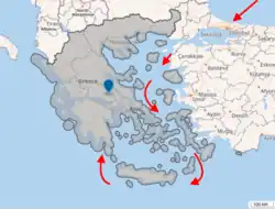 The Gulf of Lakonikos is a favourite transfer point because it is sheltered and Greek territorial waters extend only to six nautical miles from the shoreline.[90][91]