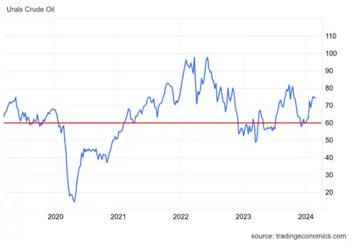 To reduce the taxation impact of the sanctions, Russia set a maximum discount to Brent oil for tax purposes of $34 in April 2023, decreasing monthly to $25 in July 2023, resulting in oil companies paying higher taxes if the real discount is higher.[41] Russia is also seeking to create a Ural price index, rather than using western indices, for tax revenue purposes.[42]