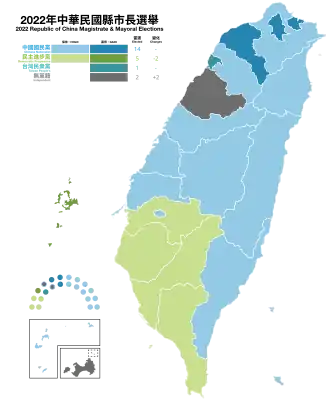 - ^ Hsu, Elizabeth; Lai, Yu-chen; Yu, Matt (26 November 2022). "ELECTIONS 2022/KMT wins big in local elections, taking four special municipalities". Central News Agency. Retrieved 26 November 2022.