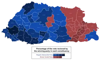 | Bartsham-Shongphu | 7,563 | People's Democratic Party | Kinzang Wangdi | 2,386 | 31.55 | |