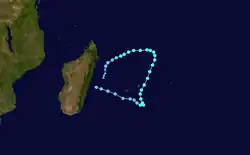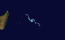 On 8 February, MFR's tropical weather discussions began to highlight the possibility of a storm gradually developing in the northeast of the Mascarene Islands.[87] It gradually organized over favorable environmental conditions with very warm sea surface temperatures and low wind shear.[88] At 00:00 UTC on 15 February, the system was classified as a tropical disturbance.[89] A day later, the system was upgraded to a tropical depression following a significant increase in curved banding.[90] Later that day, the JTWC issued a TCFA, noting a deep convection persisting around the center of circulation.[91] The JTWC upgraded the system to Tropical Cyclone 13S,[92] with the MMS naming it Djoungou a few hours later as it rapidly organized with deep flaring convection around the system's LLLC.[93][94] However, multispectral satellite imagery indicated that the cyclone had developed a banding eye feature.[95] As the eye emerged on visible satellite imagery early on 16 February, and at 18:00 UTC that day, the MFR classified Djoungou as a severe tropical storm.[96] However, a small central dense overcast (CDO) developed over Djoungou; it rapidly developed, becoming a Category 1 equivalent cyclone.[97] Soon afterward, the storm structure evolved the eye pattern and was surrounded by intense convective bursts, becoming a tropical cyclone.[98] Later, Djoungou was upgraded to a Category 4 equivalent major cyclone, with one-minute sustained winds estimated at 230 km/h (145 mph).[99] MFR immediately classified Djoungou as an intense tropical cyclone after the eye gradually improved its convective pattern.[100] However, due to wind shear, the cyclone's increasingly asymmetrical eye disappeared from satellite imagery.[101] Djoungou soon entered into an environment of increasing wind shear, causing its structure to rapidly deteriorate.[102] MFR issued its last advisory on Djoungou as it weakened into a post-tropical depression.[103] On 19 February, Djoungou crossed into the Australian basin to the west-southwest of Learmonth, Western Australia.[10]