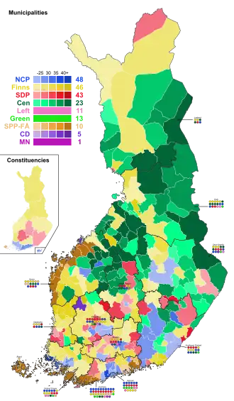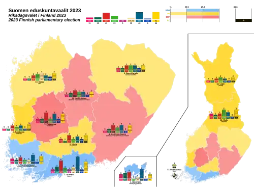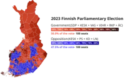 The National Coalition Party won the election with 20.8% of the national popular vote, winning 48 seats in parliament, the third-highest result in the party's history. The Finns Party came in a close second place with the ruling Social Democratic Party of Finland under Prime Minister Marin in third place. The National Coalition Party then formed a coalition with the Finns Party, the Swedish People's Party, and the Christian Democrats, with Petteri Orpo as prime minister. For the first time in Finland's history, the Centre Party did not win a plurality of votes in any regional voting districts.[1] Five government parties and four opposition parties finished with parliamentary seats split at 100–100. This was the first time since 1983 that the top-three finishing parties did not lose a percentage share of votes.