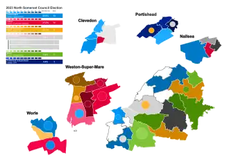 ![]() Map of the results of the 2023 North Somerset council election. Conservatives in blue, independent in grey, Liberal Democrats in yellow, Labour in red, Green Party in green and Portishead Independents in navy. | |||||||||||||||||||||||||||||||||||||||||||||||||||||||||||||||||||||||||||||||||||||||||||||