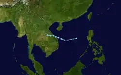 An area of low pressure formed near the Southern Philippines. On September 24, JMA recognized it as a tropical depression as it tracked westward. Around the same day, JTWC designated the system as 13W. It was tracking north-northwestward toward the Vietnam coast. The JMA last tracked the system on September 27.