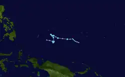 The last tropical cyclone of 2023 was formed east-southeast of Yap on December 13. Conditions for further development remained marginally conductive with sea surface temperatures of 30–31 °C (86–88 °F) and low vertical wind shear. The next day, it entered PAR, which gained the name Kabayan. On December 17, the system intensified into a tropical storm, and attained the name Jelawat. At 09:30 PHT (01:30 UTC) the next day, Jelawat made landfall in Manay, Davao Oriental, weakening into a tropical depression. JTWC later issued its last bulletin on Jelawat, stating that land interaction and lack of humidity had made the depression rapidly weaken.