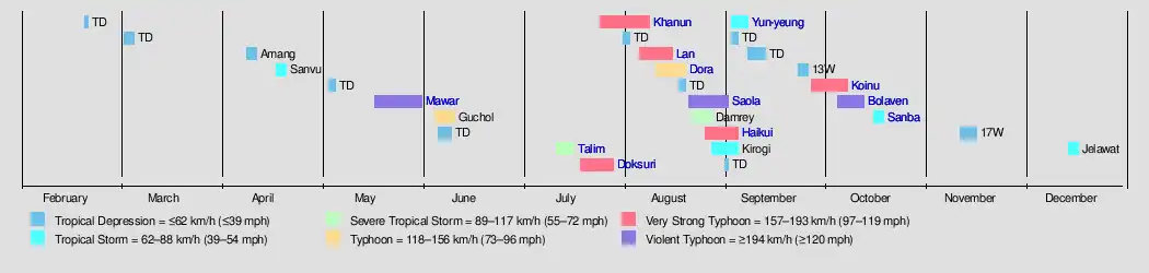 The season ran throughout 2023, though most tropical cyclones typically develop between May and October. The season's first named storm, Sanvu, formed on April 21, while its last named storm, Jelawat, dissipated on December 20. In May, Typhoon Mawar intensified into the first typhoon of the season on May 21, later becoming one of the strongest Northern Hemisphere tropical cyclones on record in May.[4]