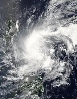 On May 5, a tropical depression was noted in the Sulu Sea by the JMA. The system crossed Palawan and entered the West Philippine Sea on the same day. The system continued to traverse the South China Sea before dissipating on May 7. On May 19, a tropical depression developed south-southwest of the Chuuk Islands. A few hours later, it became a tropical storm and was named Mawar. On the next day, the JMA upgraded the system to a severe tropical storm, as the storm was getting better defined. A day later, Mawar was classified as a Category 1-equivalent typhoon by the JTWC. The JMA followed suit and designated the system as a Typhoon on the same day; becoming the first typhoon of the year in the basin. Mawar later strengthened into a Category 2-equivalent typhoon on May 22. Then, the storm began to explosively intensify and reached Category 3-equivalent status on the same day. It further strengthened into a Category 4-equivalent super typhoon on the next day as it approached Guam. Land interaction with Guam and an eyewall replacement cycle caused the storm to weaken slightly but eventually restrengthened after passing the northern tip of Guam on May 24. The next day, Mawar completed its eyewall replacement cycle and went on to reach its peak intensity of 295 km/h (185 mph), making it a very strong Category 5-equivalent super typhoon. As Mawar entered the PAR which was named Betty by PAGASA, it encountered cooler oceans and increasing wind shear which caused it to weaken.[14] It also underwent yet another eyewall replacement cycle causing the storm to weaken further. It affected the eastern coast of Luzon and weakened to a severe tropical storm as it left the PAR on June 1. It affected the Okinawa Islands and finally turned extratropical south of Honshu on June 3.[15]