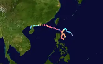 On July 13, a monsoon depression formed near Luzon. PAGASA noted the system and subsequently named the system Dodong. The system then crossed the island. The system then entered the South China Sea, where it became a tropical depression. Later, it became a tropical storm. It was named Talim. Talim moved through the South China Sea as it intensified. Near the coast of China, Talim reached its peak intensity as a Category 2-equivalent typhoon. Talim slightly weakened before making landfall in China at 22:20 CST. About six hours later, Talim entered the Gulf of Tonkin and made a second landfall. On July 18, Talim dissipated inland.[17][18]