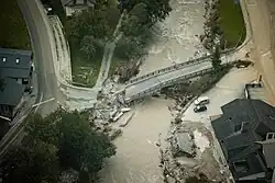 As a result of the floods, the Gorenjska highway and the Styrian highway were closed on two sections on 4 August, at 4:00 p.m. Due to this, traffic is also allowed on the highways for vehicles without a vignette. The Kranj–Jesenice, Ruše–Pilberk railway connections, the Bohinj railway tunnel and the Velenje line are also closed. Due to flooded roads and railways, public transport is difficult.[16] Several roads, both regional and local, were also closed, mainly due to collapse of the carriageway, landslides, deposits of sand and mud or high water on the roadway.[9] A bridge was washed away on Otliške Vrh and the Slovenian Army is studying the possibilities of erecting a pontoon bridge.[2] Most of the roads in Zgornje Savinjsko were also closed.[15]