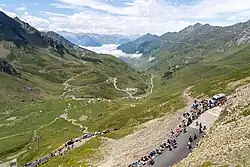 The seventh stage of the race took the riders over two major climbs in the Pyrenees mountains, and was considered as the queen stage of the race. Starting with the first category Col d'Aspin (12 km with an average gradient of 6.5 percent), riders then ascended the hors catégorie (English: beyond category) Col du Tourmalet (17.1 km with an average gradient of 7.5 percent), finishing at the summit at an elevation of 2,115 m (6,939 ft).[37][38] The climbs were last tackled by the peloton at the 2007 Grande Boucle, with a summit finish last occurring in the 2000 edition of the race.[39][40]