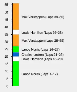 Max Verstappen, despite brake issues, won the race, his fifteenth victory in the season. Verstappen held off Lewis Hamilton and Lando Norris, who had both led during the race and ultimately finished second and third respectively. Both drivers showed pace, getting closer to Verstappen during the closing stages. Yuki Tsunoda achieved the fastest lap.[28] There were three retirements. Oscar Piastri retired with damage to his radiator and a water leak after making contact with Esteban Ocon's sidepods, which also caused Ocon to retire.[29] Fernando Alonso, who had to start from the pit lane,[25] suffered from failures of the rear suspension and the floor.[30]