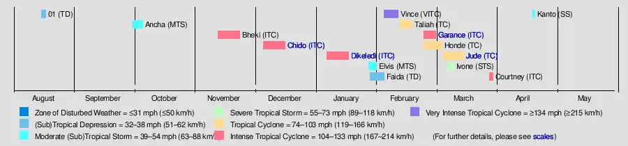 In late January, two tropical cyclones formed; one of them was the moderate Tropical Storm Faida, which brought heavy rainfall to Madagascar on 5 February. After Faida dissipated, Tropical Cyclone Vince entered the basin from the Australian region on 4 February. Four days later, it became the most intense cyclone of the season and the first very intense tropical cyclone since Cyclone Freddy two years before. At 12 February, Vince had transitioned to being extratropical. At the same day, Taliah had entered the basin fluctuating between a moderate tropical storm and a strong tropical storm before becoming a post-tropical cyclone at 18 February. Six days later, Garance and Honde had formed, Garance receiving its name the day after. Garance intensified rapidly into an Intense Tropical Cyclone, making landfall at Réunion at 28 February as a Category 2. Honde brought heavy rainfall to Mozambique and then southern Madagascar as a Category 1. Jude formed as a disturbance south of the Chagos Islands on 6 March. It intensified at 8 March, receiving its name. Ivone entered the basin on 8 March and on the same day intensified to a Moderate Tropical Storm and received its name. Jude made landfall in Mozambique as a Category 1 at 10 March. Courtney from the Australian region entered the basin on 29 March, becoming an intense tropical cyclone. After nearly a month of inactivity, Subtropical Storm Kanto was named on 20 April, reaching a peak intensity of 75 km/h (10 minute sustained) winds with a central pressure of 993 hPa. This was the first subtropical storm to receive such a designation from Meteo France, which introduced the category beginning with this cyclone season.