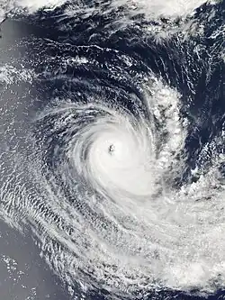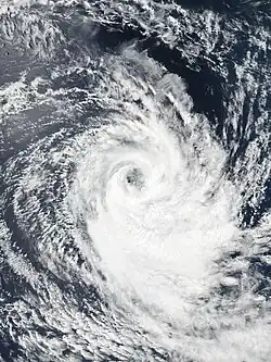 Chido originated from an elongated circulation that the MFR began monitoring on 7 December, located east of Diego Garcia.[39] In the post-storm analysis, it was indicated that the storm had already begun forming as a zone of disturbed weather on 5 December.[40] On 9 December, the JTWC began issuing warnings for the system, classifying it as Tropical Cyclone 04S, as satellite imagery showed a partially exposed low-level circulation center on the eastern side of a developing burst of deep convection, which was nearly circular in shape and had cloud tops cooler than −80 °C (−112 °F).[41] At 00:00 UTC on 10 December, the MFR reported that the system had intensified into a moderate tropical storm, with the Mauritius Meteorological Services naming it Chido, as convection strongly increased around the center of the system, accompanied by cooling of cloud tops and an expansion of the central dense overcast.[42] On the subsequent day, Chido rapidly deepened and intensified into an intense tropical cyclone within twelve hours, with its eye passing over Agalega and bringing extreme conditions to the island, where a minimum pressure of 980 hPa (28.94 inHg) was recorded.[43] This made Chido the strongest tropical cyclone to directly affect the island since Cyclone Andry in 1983.[44]