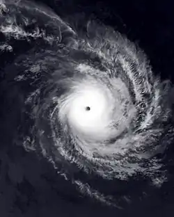 On 12 December, the JTWC upgraded the system to a Category 4-equivalent tropical cyclone, with estimated 1-minute maximum sustained winds of 250 km/h (155 mph),[45] while the MFR estimated its peak intensity with a minimum central pressure of 935 hPa (27.61 inHg) and 10-minute maximum sustained winds of 215 km/h (130 mph) as it maintained its small size and moved westwards.[46] After reaching its peak intensity, the cyclone's eye, which was 13.8 miles (22.2 km) wide, became cloud-filled and increasingly ragged, and on 13 December, an eyewall replacement cycle occurred, causing the storm to weaken.[47][48] Chido entered the Mozambique Channel on 14 December, with microwave imagery showing highly developed organized bands of deep convection.[49] As it neared Mayotte, it quickly re-intensified, with Pamandzi Airport recording a maximum gust of 226 km/h (140 mph), setting an all-time record for the station, and a minimum pressure of 982 hPa (29.00 inHg),[50] breaking the previous record of 985 hPa (29.09 inHg) set during Cyclone Kamisy in 1984. Additionally, the MFR reported that it was the strongest storm to strike Mayotte in at least 90 years.[51] Chido made landfall on Pemba in Mozambique, with 10-minute sustained winds estimated at 205 km/h (125 mph).[52] Shortly after landfall, the JTWC discontinued warnings,[53] and the MFR reported that Chido moved through Mozambique and Malawi, with convective activity gradually weakening.[54] On 16 December, Chido degenerated into an overland depression, and the MFR issued its final advisory on the system.[55]