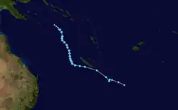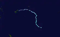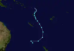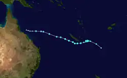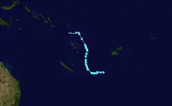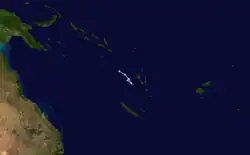 On the 24th of February, Tropical Cyclone Seru formed northeast of Vanuatu. It slowly intensified while tracking south over the next few days, becoming a Category 2 tropical cyclone on the Australian scale.[7] Seru caused minimal damage in southern Vanuatu, and dissipated into a remnant low on the 1st of March.