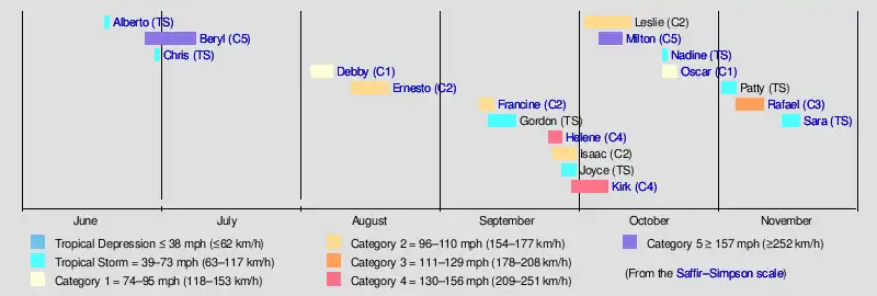 Officially, the 2024 Atlantic hurricane season began on June 1, and ended on November 30.[28] In all, eighteen tropical cyclones formed, and all of them became named storms. Eleven storms became hurricanes, of which five strengthened into major hurricanes.[29] Additionally, one potential tropical cyclone that was designated did not develop into a tropical cyclone. Altogether, there were 12 landfalling systems this season.