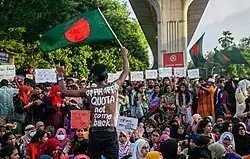 The 2024 Bangladesh quota reform movement was a series of anti-government[d] and pro-democracy[e] protests in Bangladesh, spearheaded primarily by university students. Initially focused on restructuring quota-based systems for government job recruitment, the movement expanded against what many perceived as an authoritarian government when they carried out the July massacre of protestors and civilians, most of whom were students.[f] Started as a student movement, the movement later escalated into a fully-fledged mass uprising known as the July Revolution.