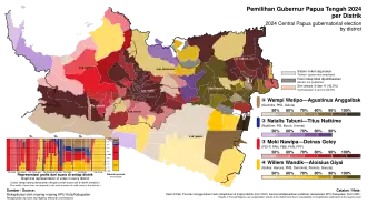 The 2024 Central Papua gubernatorial election was held on 27 November 2024 as part of nationwide local elections to elect the governor of Central Papua for a five-year term. It was the first gubernatorial election for the province since its creation in 2022.[1] The election was won by Meki Fritz Nawipa of the Indonesian Democratic Party of Struggle (PDI-P) with 45% of the vote. Willem Wandik placed second with 33%. The Gerindra Party's John Wempi Wetipo received 11% of the vote and Natalis Tabuni of the NasDem Party received 9%.