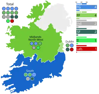 Thirteen MEPs were elected in 2019. However, the last candidate elected in Dublin and in South did not take their seats until January 2020, as part of the post-Brexit redistribution of seats. Ireland was allocated an additional seat in 2023 after a pre-election assessment of the parliament composition based on the most recent population figures.[3][1][4] The Electoral Commission recommended this seat be given to Midlands–North-West, with the transfer of County Laois and County Offaly from Ireland South.[5][6] This change was implemented by the Electoral (Amendment) Act 2023.