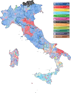 In the 2022 Italian general election, the Brothers of Italy of Giorgia Meloni arrived first with 25.98% of the vote for the Chamber of Deputies, inside the centre-right coalition, followed by the Democratic Party with 19.04%, inside the centre-left coalition.