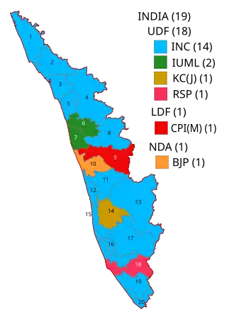 The United Democratic Front (UDF), led by Indian National Congress (INC), and Left Democratic Front (LDF), led by Communist Party of India (Marxist), contested separately in Kerala. This is in spite of both alliances being part of the Indian National Developmental Inclusive Alliance (INDIA)[2] The UDF swept the elections winning 18 out of 20 seats, one less than in 2019. The Bharatiya Janata Party (BJP) won in Thrissur, their first ever Lok Sabha seat in Kerala, while the remaining seat was won by LDF.[3]
